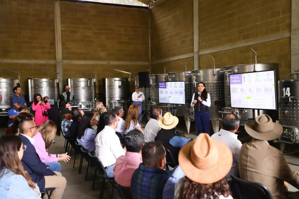 La reunión se realizó en el Centro de Valor Agregado “Viña Estación” de la Universidad Tecnológica del Norte de Aguascalientes (UTNA), en el municipio de Rincón de Romos, donde la gobernadora realizó un recorrido por las instalaciones de este espacio que en conjunto con la organización Somos Vid, apoya a productores locales para la elaboración de vino local, desde la molienda hasta el embotellamiento del mismo.