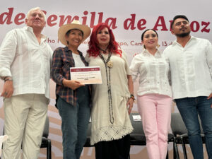 Durante el acto, el secretario Víctor Villalobos Arámbula y la gobernadora Layda Sansores entregaron certificados de semilla de las variedades Milagro Filipino, Pacífico e INIflar a los agricultores Israel Vázquez Castillo, José Carlos Hernández Medina, Irvíng Eduardo Mendoza Rodríguez, Antonio Rivera Solano, Salvador Gil Coronel y Josefina Delia Castillo Solís.