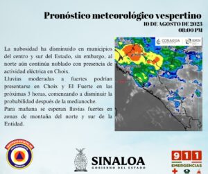 “Se indican lluvias fuertes, nuevamente en lo que es zona de montaña, igual lo que es al norte, El Fuerte, Choix, se están pronosticando lluvias fuertes e intensas, en lo que es el centro aquí en Culiacán se están viendo lluvias ligeras y moderadas, pero en general se estarían presentando en todo el estado, esperemos que así sea, y de momento es lo que se tiene para mañana y sí, seguirán las lluvias”, aclaró.