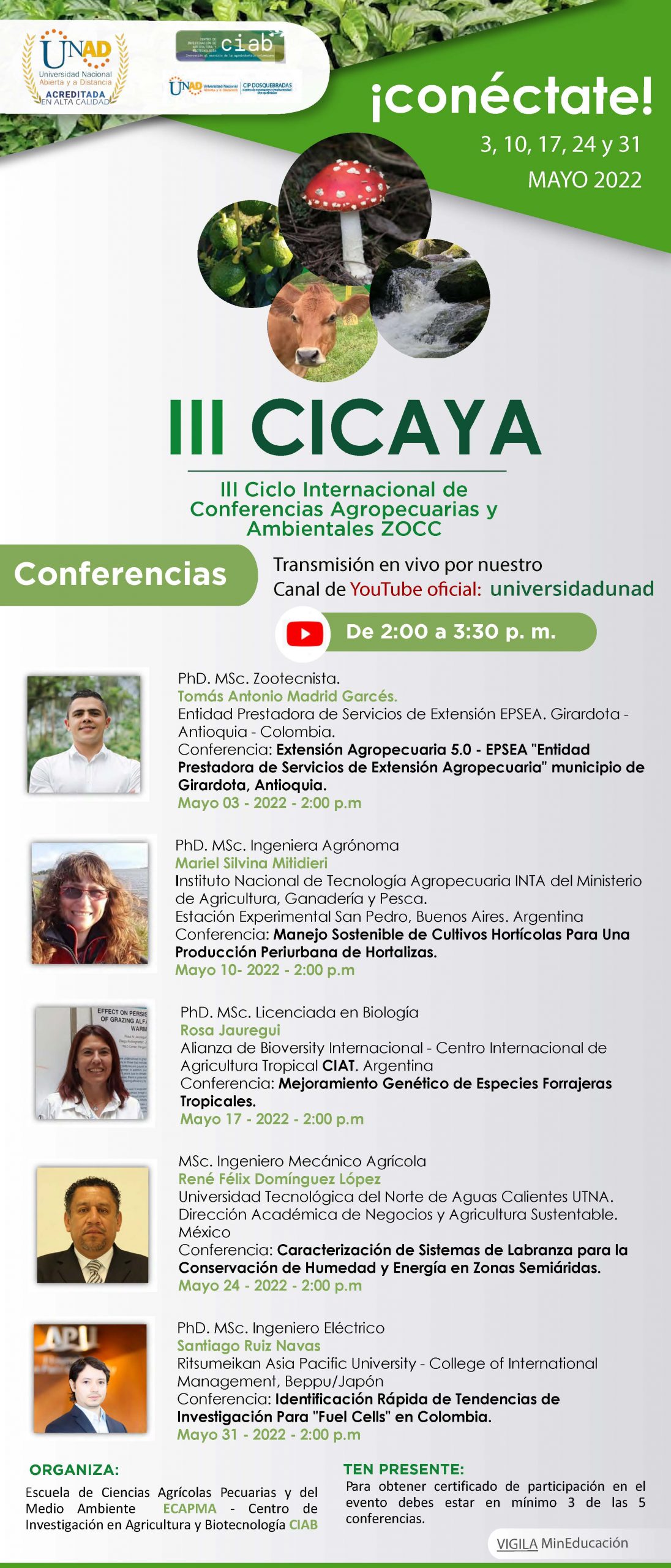 El III Ciclo Internacional de Conferencias Agropecuarias y Ambientales CICAYA inició el martes 3 de mayo, y continuará los días, 10, 17, 24, y 31 del presente mes, el cual es abierto al público y se podrá seguir a través del canal oficial de You Tube de la Universidad UNAD de Colombia. Cabe hacer mención que el congreso es de acceso libre (gratuito) sin inscripción previa, y se certifica con asistencia mínima a 3 de las 5 conferencias.