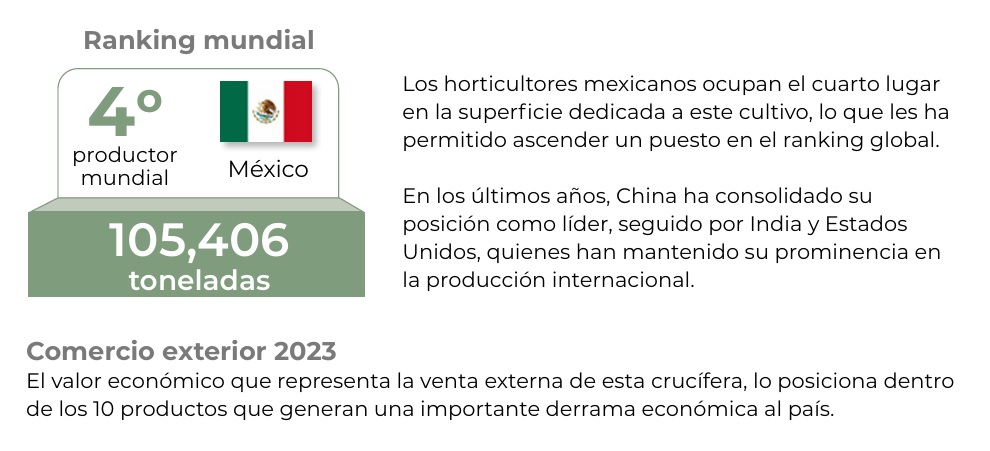 También informó que en el 2023, en Guanajuato se sembraron mil 865 hectáreas de esta hortaliza, que se puede consumir cruda o cocida en diversas preparaciones y representa una gran fuente de nutrientes como vitaminas C y B6, además de minerales necesarios para la salud como el potasio, el calcio y el fósforo.