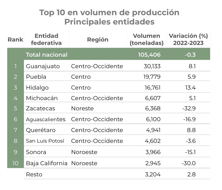 La última producción reportada fue de 30 mil 133 toneladas anuales, con un valor de $190 millones 720 mil 75 pesos. Los municipios que más produjeron fueron: Doctor Mora, Silao, Salamanca, San Luis de la Paz y Juventino Rosas. Esto al cierre del 2023, de acuerdo con el Servicio de Información Agroalimentaria y Pesquera (SIAP).