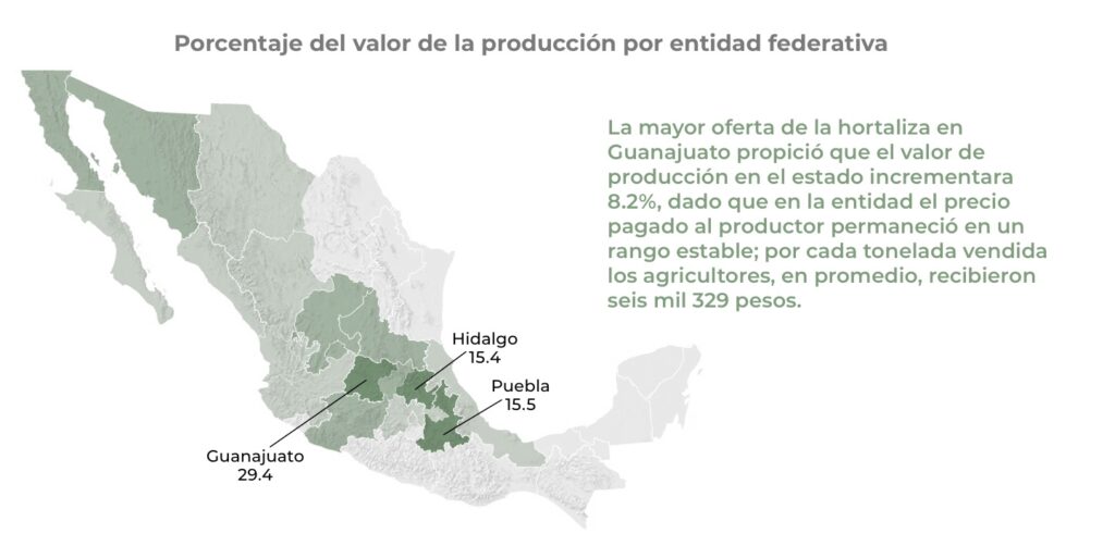 La mayor oferta de la hortaliza, que se da en nuestro estado, propició que el valor de producción incrementara un 8.2%, dado que en Guanajuato el precio pagado al productor permaneció en un rango estable; por cada tonelada vendida, los agricultores recibieron, en promedio, $6 mil 329 pesos.