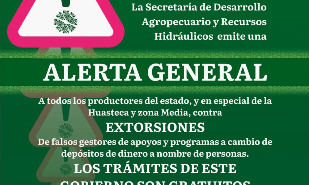 SAN LUIS POTOSÍ, SLP.- La Secretaría de Desarrollo Agropecuario y Recursos Hidráulicos (Sedarh), emitió una alerta general a las y los productores del campo, para evitar...